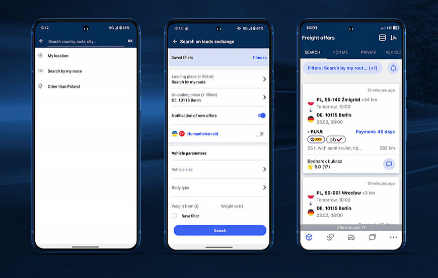 за търсене в приложението Trans.eu, отидете в раздел “Търсене” и въведете запазени филтри. Добавете нов филтър и кликнете върху мястото за товарене, след което изберете “Търсене по моя маршрут”. След това задайте мястото за разтоварване. Благодарение на GPS координатите, приложението ще търси оферти за товари в близост до вашето превозно средство в реално време.